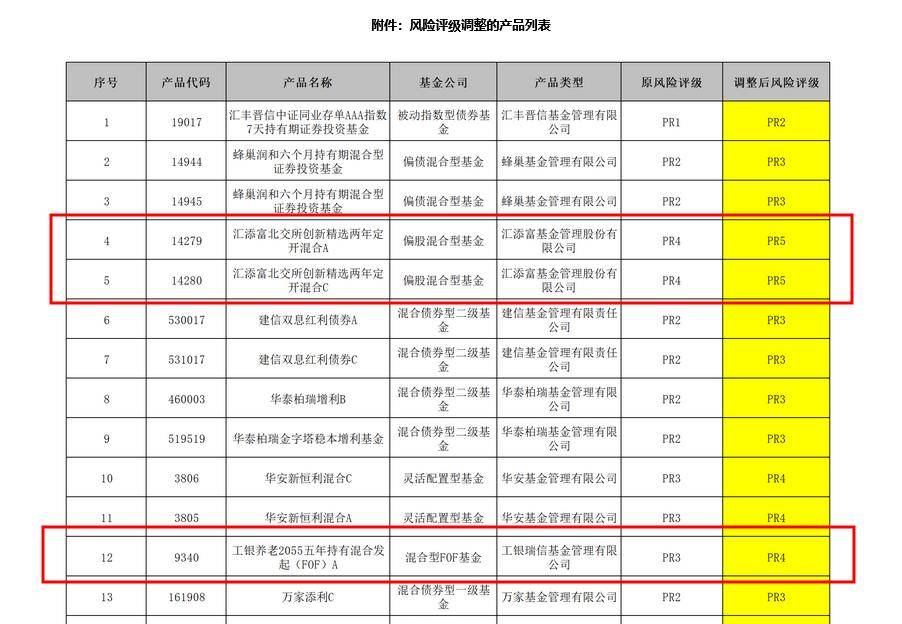 其中,汇添富基金的两款北交所主题的偏股混合型基金从PR4上调至PR5(最高风险等级)。并且,颇为罕见的是,中信银行本次还将工银瑞信基金的一款养老主题产品“工银养老2055五年持有混合发起(FOF)A”的风险评级从PR3上调至PR4。