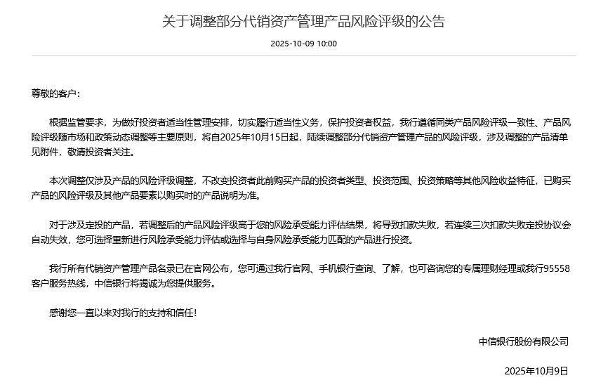 2025-10-12南宫28官网,南宫28官方网站,南宫28APP下载10月9日,中信银行在官网发文称,将自2025年10月15日起,陆续调整部分(共计17款)代销资产管理产品的风险评级。