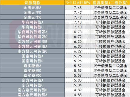 具体来看,部分混合债基今年的净值已上涨超过7%,金鹰元丰A/C/D、华商可转债A/C、嘉实稳宏A/C/D等回报居前。