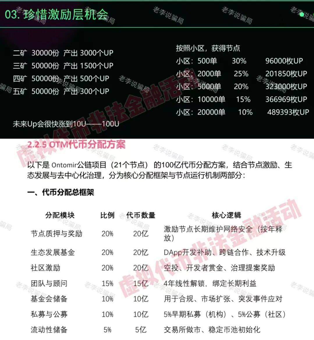 对外定位为“RWA产业级专属公链”,主打区块链与传统产业资产。发行原生代币OTM,代币分配涵盖节点质押奖励、生态发展基金、社区激励等七大模块。