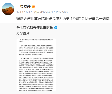 2026年1月13日,嫣然医院的官方微博发布了《北京朝阳区天使儿童医院关于房租债务的回应》,就长期租金欠缴问题向社会说明。医院法定代表人李亚鹏随后转发该声明,表态“嫣然天使儿童医院也许会成为历史,但我们会站好最后一班岗”。