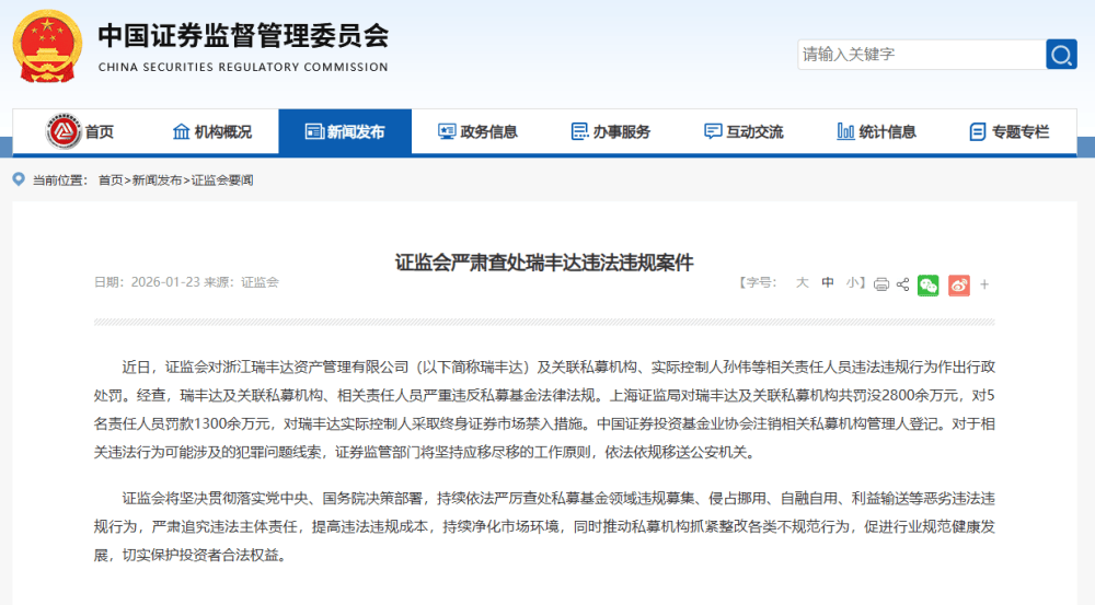 2026-01-29南宫28官网,南宫28官方网站,南宫28APP下载近日,证监会对浙江瑞丰达资产管理有限公司(以下简称“瑞丰达”)及关联私募机构、实际控制人孙伟等相关责任人员违法违规行为作出行政处罚。