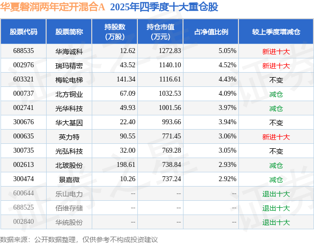 根据2025基金年报公募基金重仓股数据,重仓该股的公募基金共5家,其中持有数量最多的公募基金为华夏基金的华夏磐润两年定开混合A。华夏磐润两年定开混合A目前规模为1.78亿元,最新净值1.3978(3月3日),较上一交易日下跌4.12%,近一年上涨36.18%。该公募基金现任基金经理为张城源。张城源在任的基金产品包括:华夏磐泰混合(LOF)A,管理时间为2016年12月26日至今,期间收益率为84.74%;华夏磐利一年定开混合A,管理时间为2020年7月29日至今,期间收益率为110.78%;华夏磐锐一年定开混合A,管理时间为2020年12月22日至今,期间收益率为98.32%;华夏磐益一年定开混合,管理时间为2021年1月26日至今,期间收益率为67.0%。
