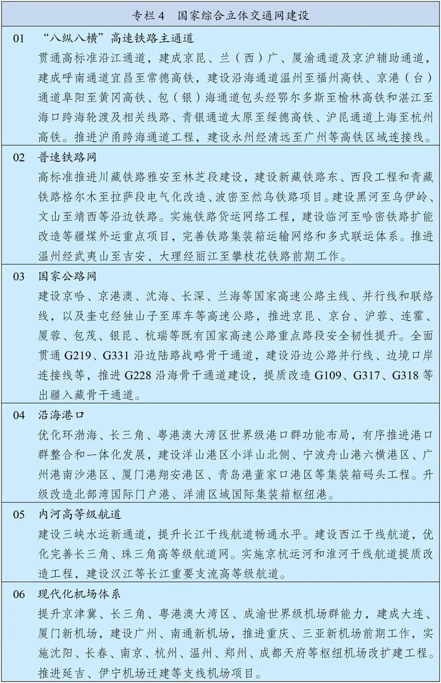 推进补网强链提质,加强跨区域统筹布局、跨方式一体衔接,全面提高交通基础设施综合效益。完善国家综合立体交通网主骨架,高质量建设沿海沿边沿江、出疆入藏、西部陆海新通道等战略骨干通道,基本建成“八纵八横”高速铁路主通道和国家高速公路网,推进内河高等级航道提质升级,基本建成世界级港口群和机场群。强化薄弱地区覆盖和通达保障,推动普速铁路、普通国省道升级改造,开展新一轮农村公路提升行动,加强西部地区铁路和支线机场建设,完善边境地区路网布局。建设国际性、全国性综合交通枢纽城市,加强集疏运网络建设和场站衔接,完善国家邮政快递枢纽。健全多元化、韧性强的国际运输通道体系,推动跨境交通基础设施互联互通,促进国际航空货运健康有序发展。统筹功能提升和绿色安全智能发展,推进交通基础设施更新改造和养护管理,加强安全风险评估和监测预警,实施公路安全韧性提升工程。深化综合交通运输体系改革,推进铁路体制改革和收费公路政策优化。