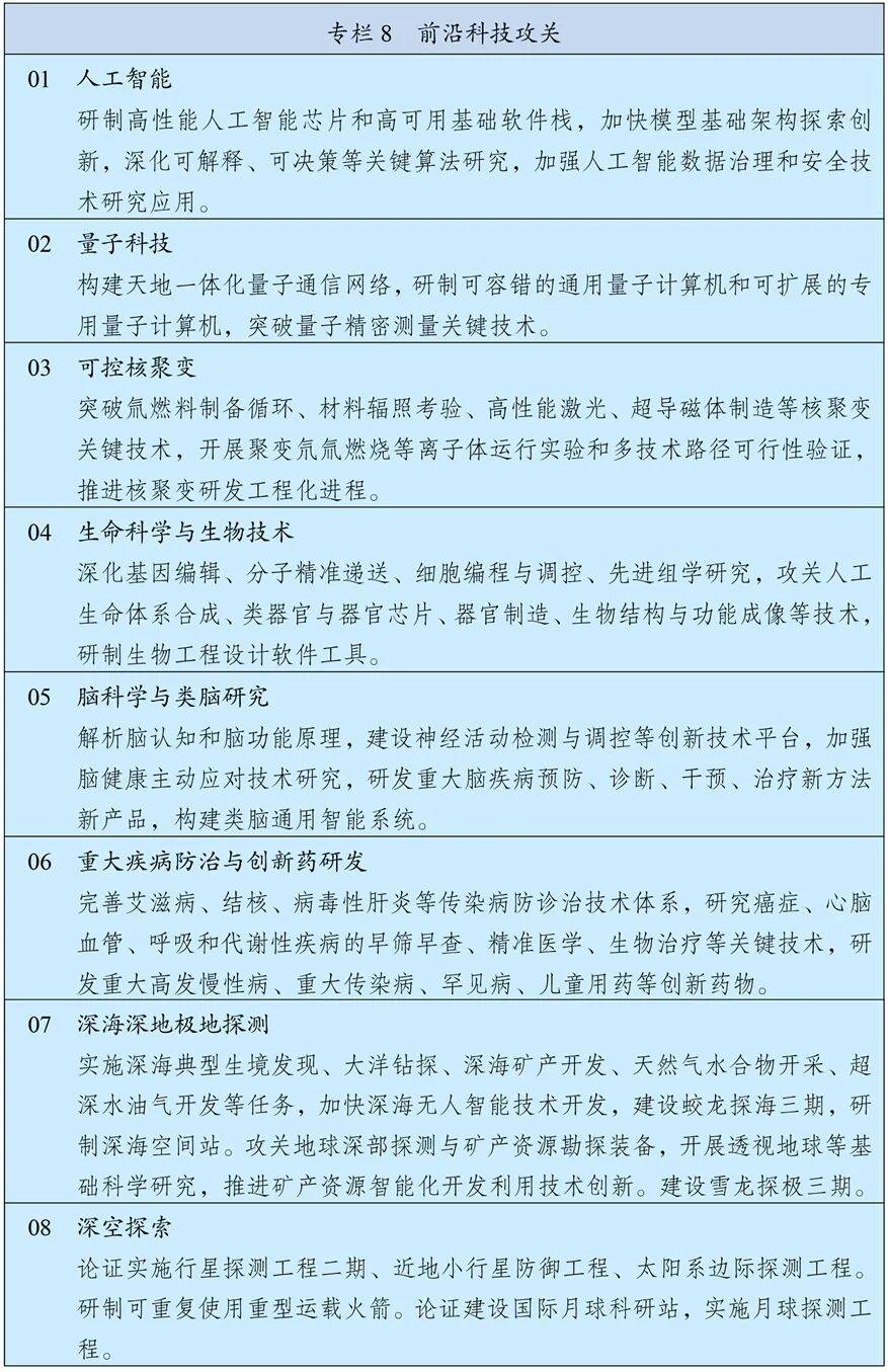 瞄准世界科技前沿强化系统布局,实施人工智能、量子科技、生物科技、新能源等科技战略部署,加快突破基础理论和底层技术,促进转化应用。高水平组织前沿技术预测预见,建立国家关键和新兴技术清单,持续推动前沿技术研发。强化科学研究、技术开发原始创新导向,优化有利于原创性颠覆性创新的环境,创新非共识项目遴选和资助机制,扩大国家重大科技任务、国家自然科学基金原创性颠覆性项目规模和比例。突出国家战略需求,扎实推进国家科技重大专项,超前部署面向2035的国家重大科技项目。