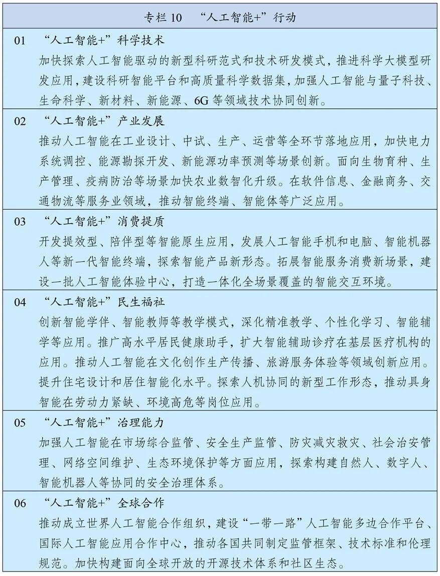 全面实施“人工智能+”行动,加强人工智能同科技创新、产业发展、文化建设、民生保障、社会治理相结合,抢占人工智能产业应用制高点,全方位赋能千行百业。