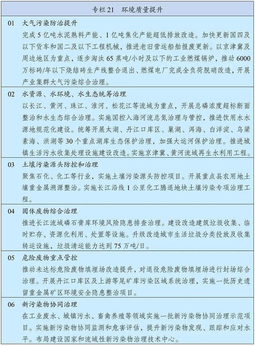 持续深入推进污染防治攻坚,以更高标准改善大气、水、土壤环境质量。以京津冀及周边、长三角、汾渭平原等重点区域为主战场,强化细颗粒物(PM2.5)控制,深入推进重点行业超低排放改造,推动挥发性有机物源头替代和全流程治理,制定下一阶段机动车排放和油品质量标准,深化大气环境绩效分级管理,氮氧化物、挥发性有机物排放量分别下降8%以上,进一步消除重污染天气。加强长江中游、成渝等区域大气污染防治。加强餐饮油烟、恶臭异味和环境噪声污染治理。统筹水资源、水环境、水生态治理,以解决全流域和跨省界突出问题为重点,加强重要江河湖库系统治理和生态保护,基本完成重点流域海域入河入海排污口排查整治,化学需氧量、总磷排放量分别下降6%,巩固城市黑臭水体治理成效、基本消除县乡黑臭水体。加强土壤污染源头防控,推进受污染耕地、建设用地安全利用。