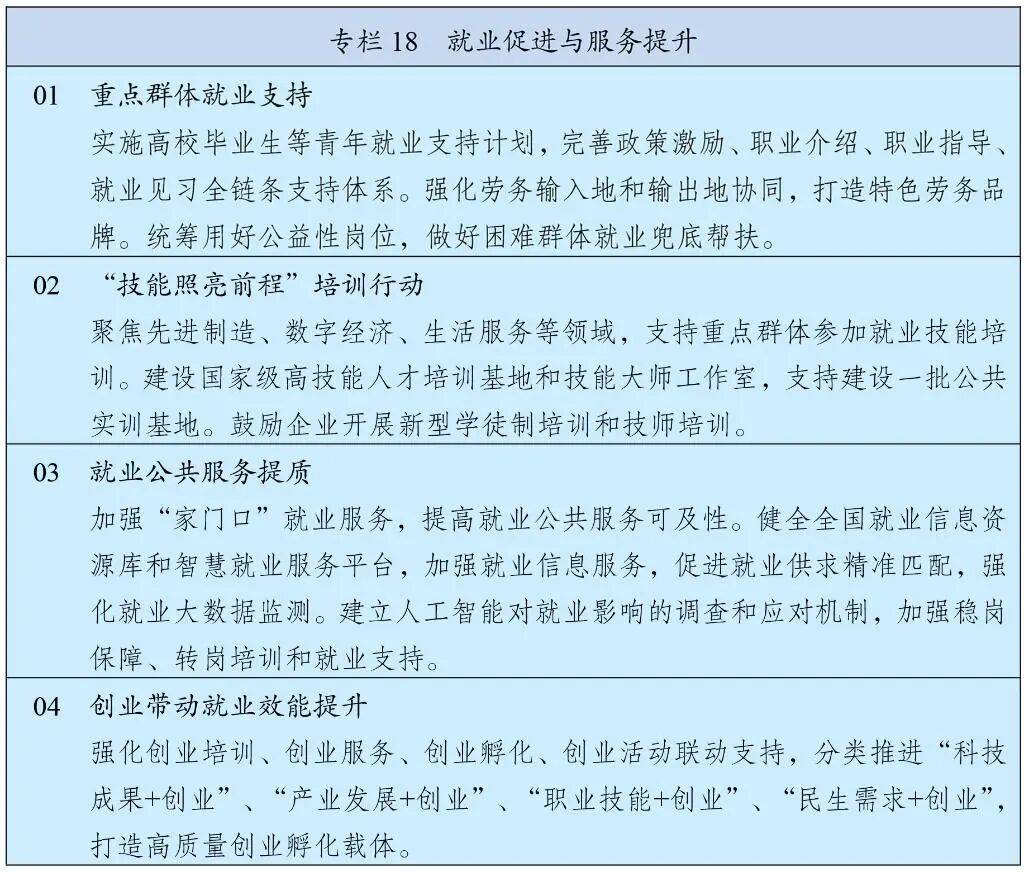 把高质量充分就业作为经济社会发展的优先目标,健全重大政策、重大项目、重大生产力布局就业影响评估机制。加强产业和就业协同,实施稳岗扩容提质行动,对外贸、建筑、住宿、餐饮等吸纳就业多的行业企业持续强化政策支持,充分挖掘服务业、新兴领域吸纳就业潜能,推动灵活就业、新就业形态健康发展。稳定和扩大高校毕业生、农民工、退役军人等重点群体就业。加强困难群体就业帮扶,促进失业人员再就业,确保零就业家庭至少一人实现就业。加大创业支持力度,增强创业带动就业效应。综合应对外部环境变化和人工智能等新技术发展对就业的影响。建立高质量充分就业评价体系。