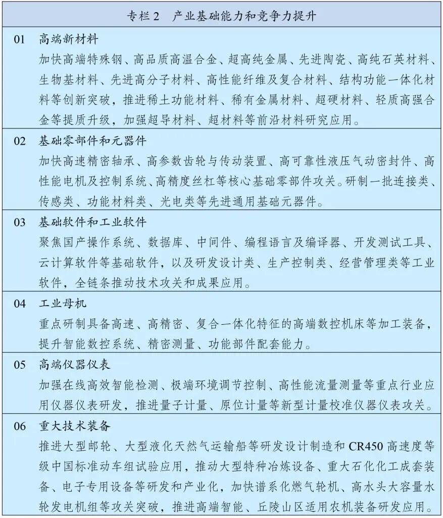 实施产业基础再造工程,加快突破一批重大基础技术、工艺和产品,推进先进材料、跨尺度制造等创新应用。实施重大技术装备攻关工程,突破一批标志性重大技术装备。滚动实施制造业重点产业链高质量发展行动,建立健全产业链供应链安全风险评估和应对机制,持续增强稀土、稀有金属、超硬材料等竞争优势,加强重要战略性矿产高质高效综合利用。推进国家战略腹地建设和关键产业备份,建设战略性产业基地、物资储备基地和基础设施。建立产业基础竞争力调查制度,强化共性技术研发支撑能力。完善首台(套)、首批次、首版次应用政策。