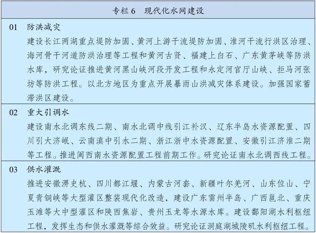 加强国家水网建设,增强洪涝灾害防御、水资源统筹调配、城乡供水保障能力。统筹流域性洪水和局域性灾害防御,加强防洪水库、河道及堤防、蓄滞洪区建设,推进中小河流系统治理和病险水库除险加固,增雨集中区防洪避险能力。健全跨流域跨区域水资源调配体系,完善国家水网主骨架和骨干输配水通道。加强供水灌溉保障,整装推进大中型灌区建设改造,加快城市应急备用水源工程建设。加强河湖生态保护治理,推进水源涵养与水土保持,提升水生态系统自我修复能力。实施地下水保护治理行动,逐步实现采补平衡。