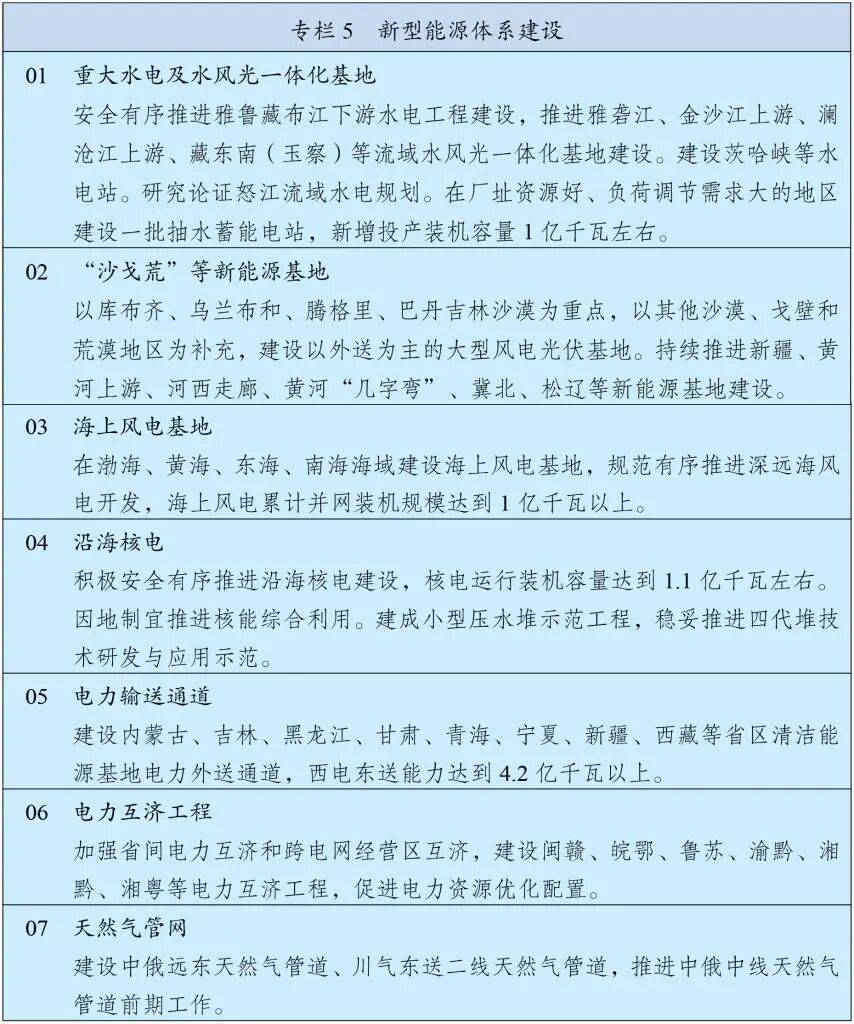 深入实施能源安全新战略,加快构建清洁低碳安全高效的新型能源体系,建设能源强国。推进非化石能源安全可靠有序替代化石能源,坚持风光水核等多能并举,实施非化石能源十年倍增行动。统筹就地消纳和外送,建设“三北”风电光伏、西南水风光一体化、沿海核电、海上风电等清洁能源基地,加强分布式能源就近开发利用,布局发展绿色氢氨醇,积极推进光热发电和地热能利用。加强化石能源清洁高效利用,推进煤电改造升级和散煤替代。着力构建新型电力系统,全面提升电力系统互补互济和安全韧性水平,优化全国电力流向和跨区域通道布局,加快智能电网建设,完善城乡配电网,科学布局抽水蓄能,大力发展新型储能。提高终端用能电气化水平,推动能源消费绿色化低碳化。基本建成全国统一电力市场体系,完善油气“全国一张网”运行调度机制。