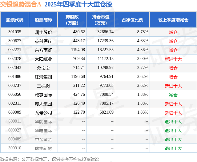 根据2025基金年报公募基金重仓股数据,重仓该股的公募基金共25家,其中持有数量最多的公募基金为交银施罗德基金的交银趋势混合A。交银趋势混合A目前规模为32.14亿元,最新净值5.392(4月3日),较上一交易日下跌0.84%,近一年上涨27.2%。该公募基金现任基金经理为杨金金。杨金金在任的基金产品包括:交银启诚混合A,管理时间为2021年12月8日至今,期间收益率为46.75%;交银瑞元三年定期开放混合,管理时间为2023年10月27日至今,期间收益率为42.78%。