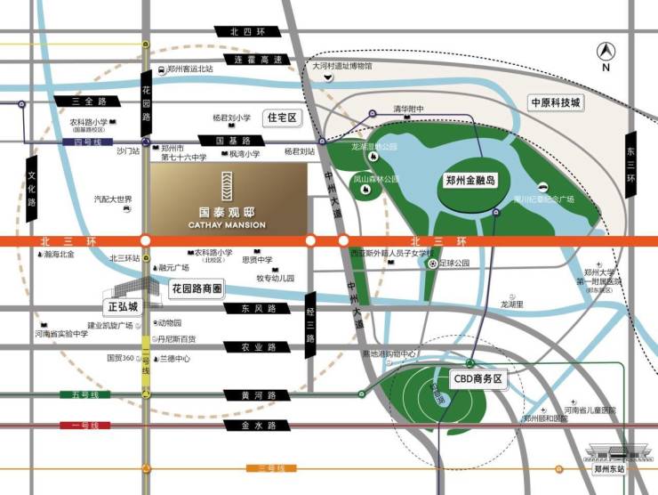 金北环之上 中央生活坐标 ,横跨花园路至经三路黄金地段 ,左拥正弘城、国贸360、建业凯旋广场等黄金商圈,右抱北龙湖金融岛、CBD,10 分钟即可通达郑州最高端最具人气的核心地点