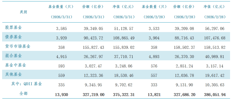 而债券基金却逆势实现规模增长。债券基金在2026年3月底的规模是108865.49亿元,与2月底的107476.68亿元相比增长1388.81亿元。债券基金作为固收类资产,在3月股市震荡的环境下,其避险属性凸显,因而吸引资金流入。